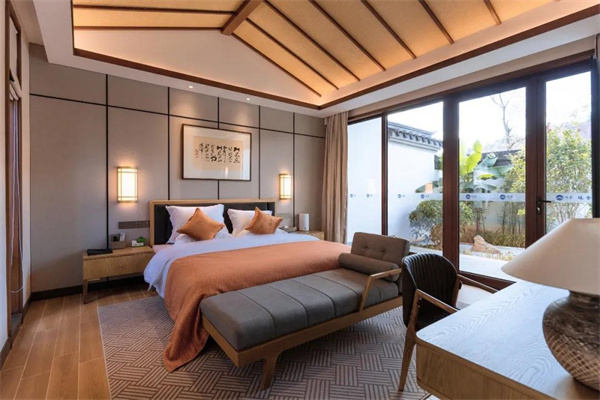 合院與周邊自然景觀相得益彰,房間采用智能控制,并設有休閑區、茶飲間、泡池等設施,極力為居客營造安心舒適、歡暢自由的私密人居空間。