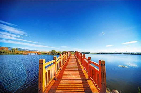 一進入星海半島濕地公園,湖畔蘆葦、菖蒲等水生植物叢生,濕地棧道從中蜿蜒穿過,漫步其中,能夠零距離感受濕地野趣。湖塘節點處還種植了荷花,不時看到白鷺、喜鵲、翠鳥等野生鳥類,在水草叢中覓食。