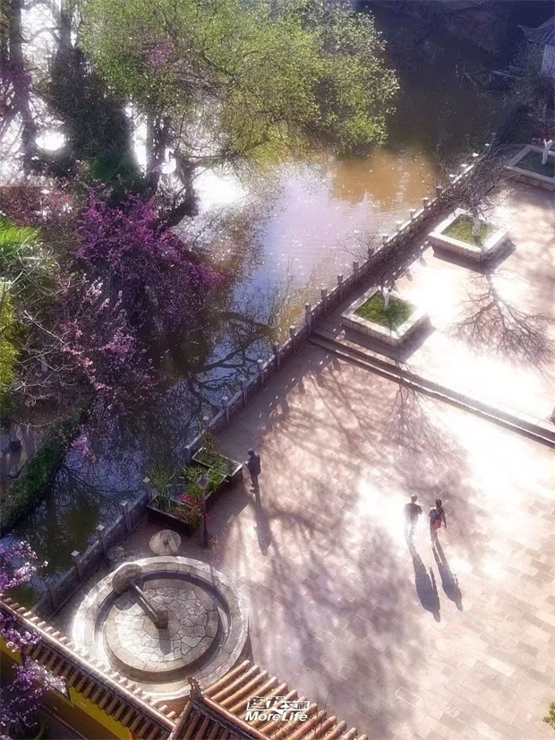 ,花枝低垂處于潭水相接,水波倒映著形成“花影樹影兩婆娑”的奇觀;有的與龍泉觀飛檐斗拱相映成趣,明代茶花與宋
