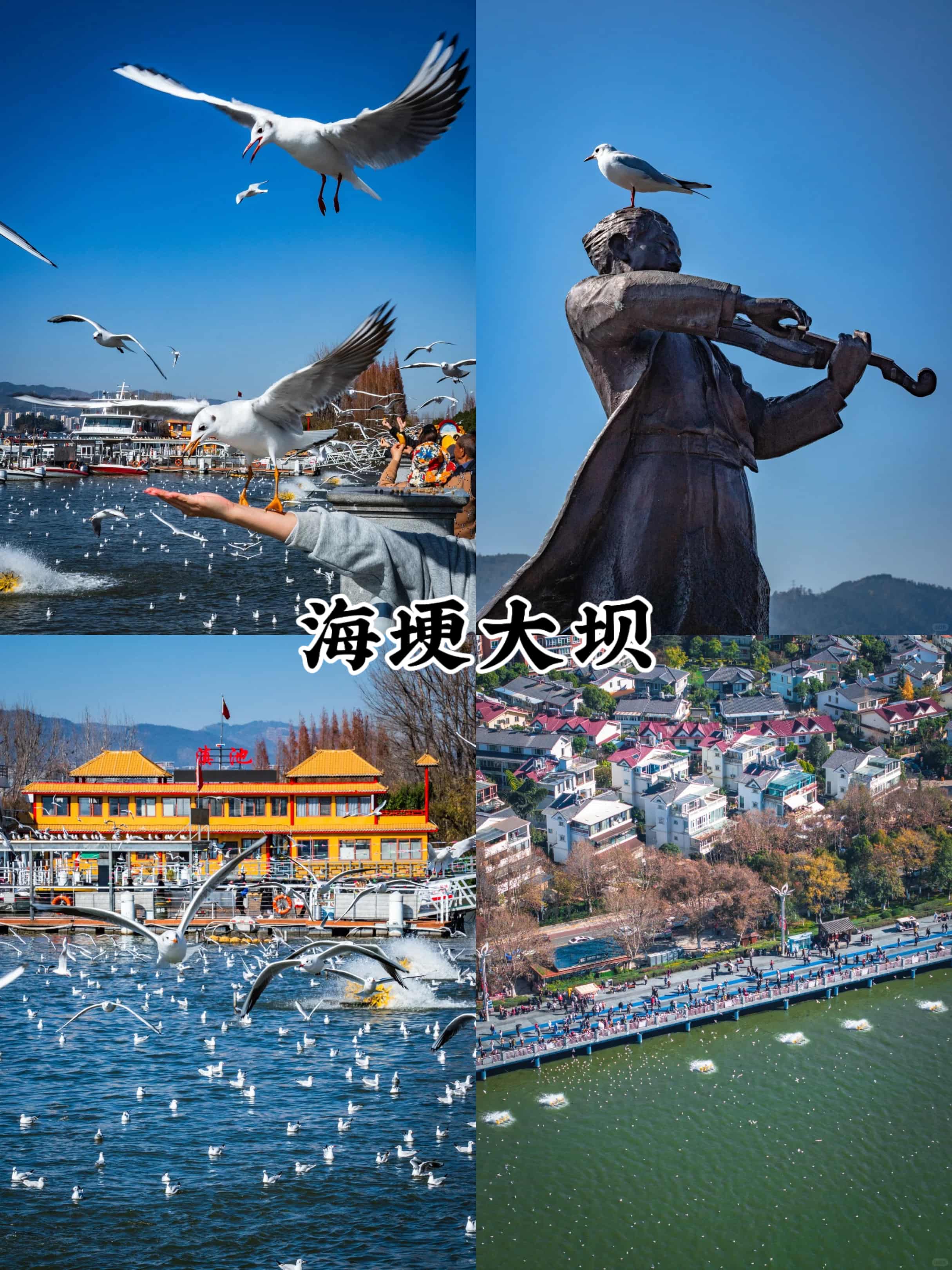 - 滇池海埂大壩:作為滇池的核心觀景點,大壩長約3公里,視野開闊。可租共享單車騎行,或步行至**海埂公園**,欣賞湖光山色。10月底的滇池碧波萬頃,偶見候鳥掠過,日落時分尤為壯美。大壩免費開放,建議預留2小時。