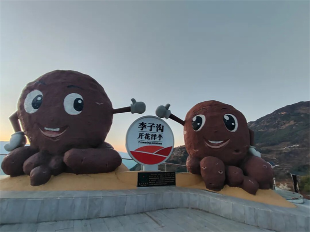 觀景臺上,一對精心設計的、代表李子溝村特色的碩大開花洋芋充滿童趣,一間以鏡子為墻壁的咖啡屋里,咖啡師們正