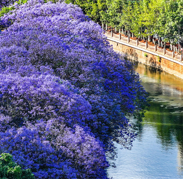 。導航至 “油管橋” 附近,沿著盤龍江一路向南。這里的藍花楹因水分充足,長得高大粗壯,花朵飽滿。最絕妙的是江水