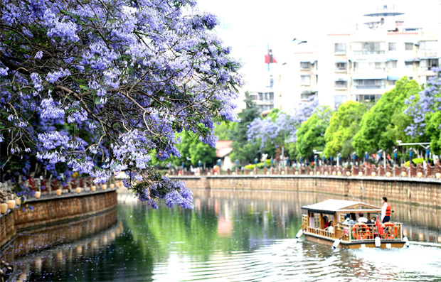 園。這個藏在官渡區(qū)的寶藏公園,藍花楹數量不算多,但每一棵都種在了水岸邊。公園里有亭臺樓閣、小橋流水,搭配