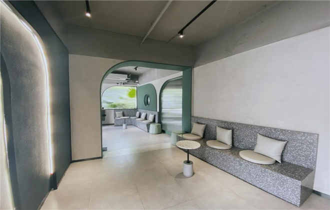 一進門是大堂,再往里走,半圓拱門,桌椅落地窗綠植,深綠色、水磨石 灰色為主,整體安靜舒服。