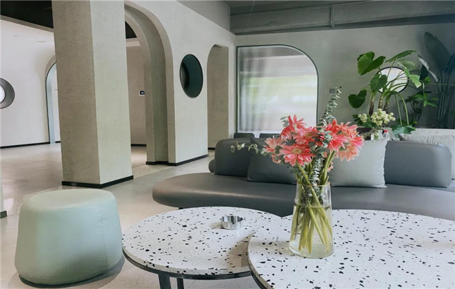 一樓整個公共開放區域每個角落都可以出片,桌上點綴的鮮花與周圍綠植相映成趣。