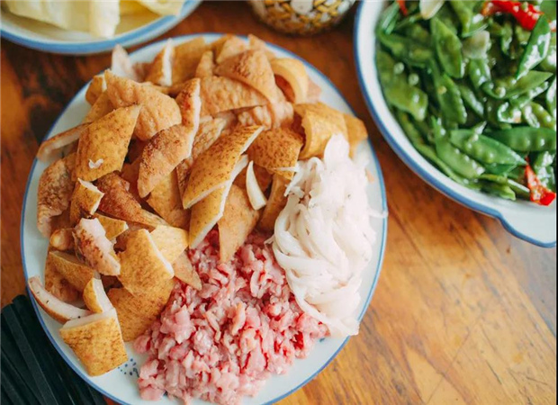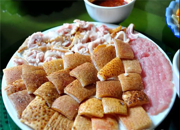 生皮,又是一道很多人不敢嘗試的白族特色菜。雖然叫生皮,但并不完全就是生的,經過烤制后達到最佳口感,配上酸辣的蘸料。