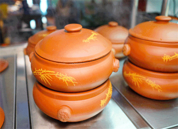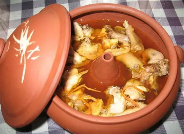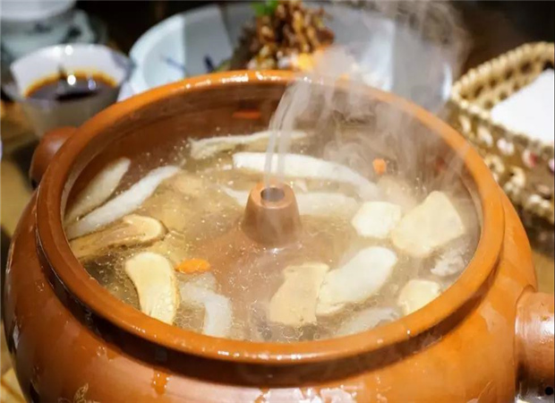 汽鍋雞的烹飪,需用建水陶特制的汽鍋慢慢蒸制。蒸汽會通過汽鍋中的汽嘴將雞蒸熟,凝結成水的蒸汽就變成湯汁。