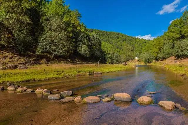 溪流潺潺,清澈見底的河水緩緩流淌,流域內森林覆蓋率極高,水質清澈,一年四季叮咚流淌,