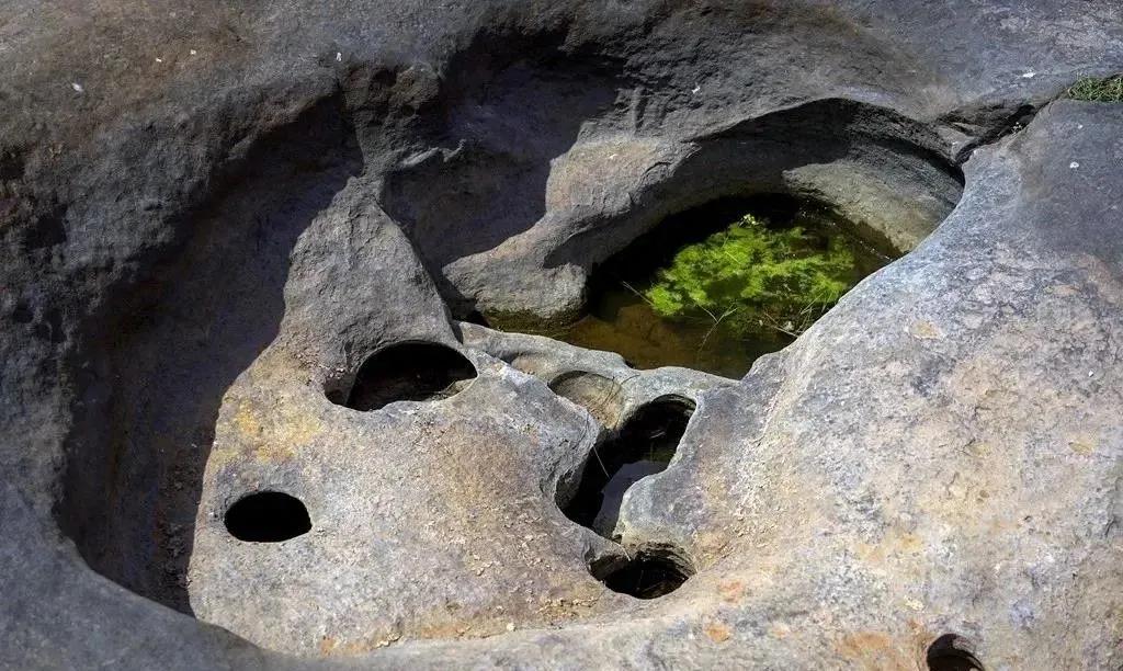 河中凹陷的洞形成了積水,有的深不可測,有的清碧見底,潭頭潭尾飄著青苔,猶如少女染成了綠色的長發,