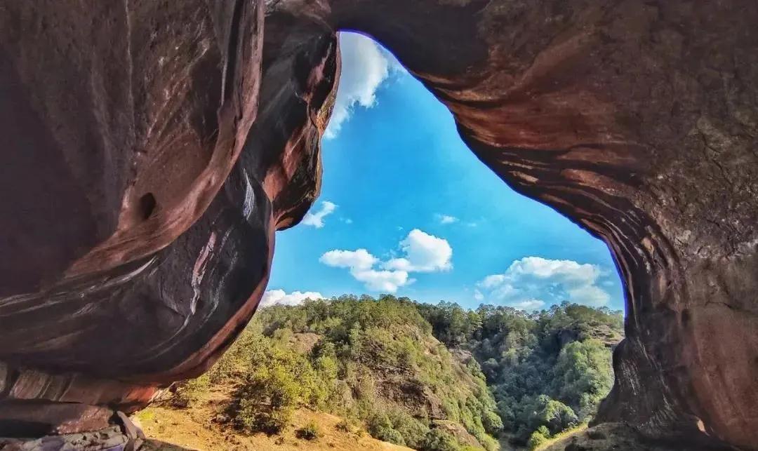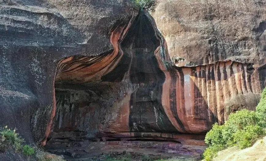 其中的丹霞地貌經過上萬年的雨水侵蝕,形成了一個大山洞,山洞的造型很奇特,奇特怪異的紅砂巖,彩色的山崖,