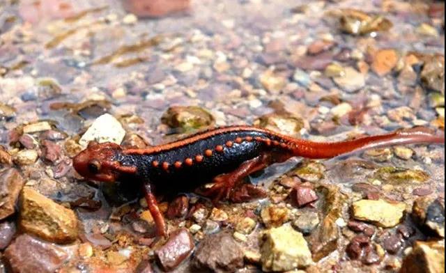 紅瘰(luǒ)疣螈,為蠑螈科兩棲動物, 在云南西部分布較廣。雄螈全長136毫米~150毫米,雌螈147毫米~170毫米。紅瘰疣螈頭部平扁,兩側(cè)脊棱顯著隆起,無唇褶,好似傳說中的麒麟的角,所以民間又有“金麒麟”之說。它的身體兩側(cè)長了瘰粒,一般一側(cè)為14~16枚,像極了排列整齊的“乳釘紋”,頗為有趣。身上色彩也頗為鮮艷,背部和體側(cè)為棕黑色,而頭部、背脊棱、體側(cè)瘰粒、尾部、四肢、肛部周圍均為棕紅色或棕黃色,喜食蚯蚓、蜈蚣、步行蟲、蝸牛等。如果實在喜歡紅瘰疣螈,能買一只或捉一只當(dāng)寵物養(yǎng)嗎?當(dāng)然不可以,紅瘰疣螈是國家二級重點保護野生動物,無論是捕捉了用于自養(yǎng)還是用于買賣,都屬違法。