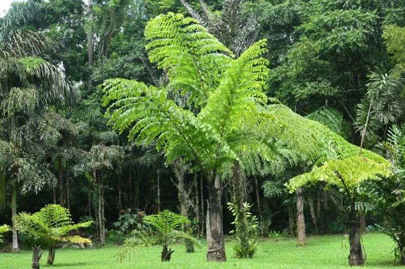 董棕也是熱帶雨林中的一員,生于石灰?guī)r山地區(qū)或溝谷林中,云南西雙版納東南部的熱帶溝谷雨林是它主要的分布區(qū)域之一。它高可達三十余米,即使熱帶樹木普遍高大,董棕也能“木秀于林”。葉片長可至七八米,寬可至五米,比小巴車還要大。十余片葉片聚生于頂端,真如巨傘一般。
