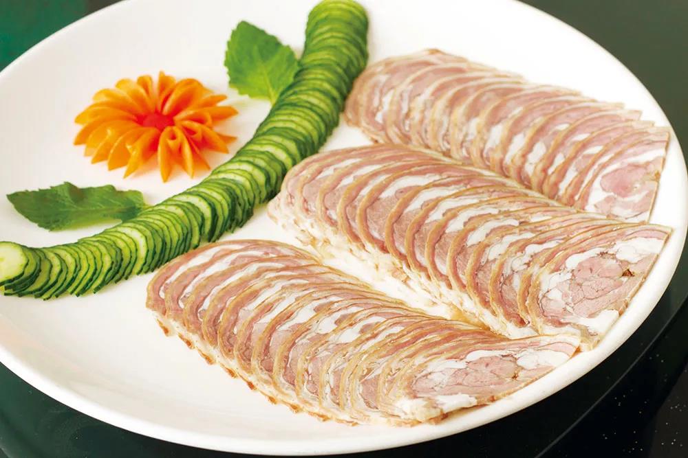 峰浪望月其實就是羊肉涼片,專用黑山羊的脊肉做成。把脊肉用肥肉包瘦肉的方法緊緊裹起來,卷包成團,放到燜鍋里燉煮3個多小時。傳統的炊具是曲靖土產的土陶鍋,土陶鍋是鑲在爐邊的,鍋里的羊肉受到四周傳來的熱氣的熏陶,烹煮時間一到,揭開鍋蓋,滿室異香。被燉得爛熟的羊肉冷定成形,切片、冷食。涼片肥瘦分明,不需要任何佐料或蘸水,已是軟香適口。峰浪望月的菜名是王天順根據菜品外觀取的。