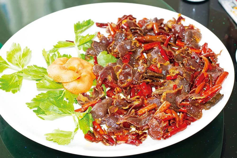 羊干巴的腌制非常講究時令,非得到冬至才能開始制作,最好的制作時節便是冬至后的一個月內。用精鹽腌制六、七天,拿出來自然風干。“我嘗試過在各個時間腌制羊干巴,但就這個時節的干巴會產生一股老干巴特有的清香。其實這是傳統的老方法, 腌干巴溫度一高就不行。”羊后腿適合制作干巴,“每只羊就那么點腿肉,有時候腌的量根本供不上賣,還會斷貨。”腌制后的羊干巴切薄片,和干辣椒溫火慢炒,色澤紅亮,肥瘦相間,膻味不重,口感酥脆,帶著不同于其它干巴的特有香味。