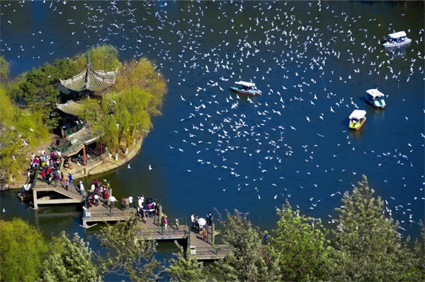 翠湖一直是水鳥的聚集繁殖地。春天,成百上千的黃鶯鳴啼枝頭,冬天,紅嘴鷗匯聚湖畔,上演人與自然和諧的畫面。