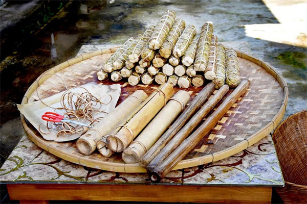 將回軟后的茶葉裝入竹筒中,用黃栗木杵舂壓造型,制成松緊適度的圓柱狀茶筒,一般規格為:筒長30-33cm左右,直徑5-6cm左右,重量約150-200g;圓柱形茶筒底部和上部用筍葉剪成與茶筒直徑大小相當的圓形小片作墊層,筒體用扎篾、青藤或葛麻藤交叉纏繞捆扎,然后干燥、包裝。