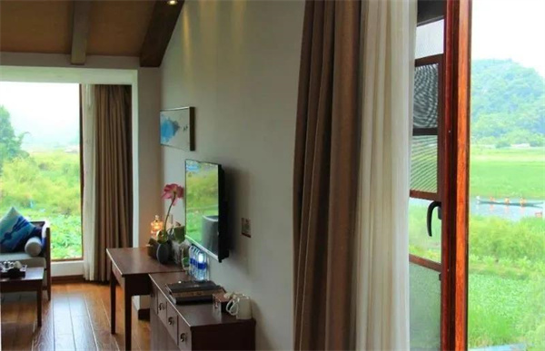 民宿身處普者黑景區(qū)中,在景點情人橋旁。民宿一樓的長廊在一個偌大的荷花池邊,每個房間面對廣闊的池塘,每當(dāng)荷花盛開的時節(jié),滿池的荷花搖搖曳曳,讓人心醉。池塘連著大片的山水風(fēng)光,可以說每間房都是風(fēng)景房。