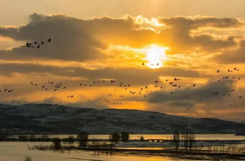 清晨,濃霧散去,遠處淺灘中一群黑頸鶴正在伸腿展翅,梳妝打扮,時而棲息,時而拍打著翅膀掠過湖面,它們的存在讓念湖的浪漫多了一層靈動。