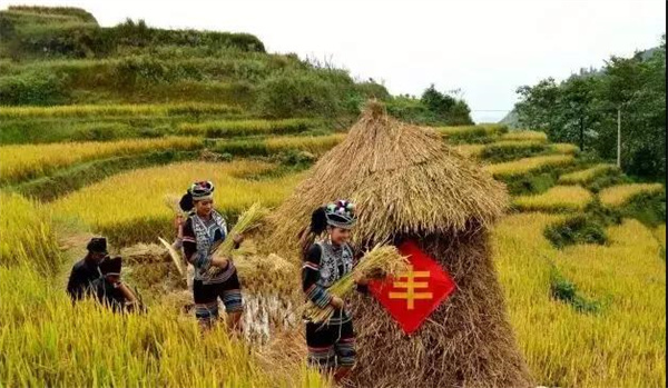 打稻谷的時候,先由老人做個祭祀儀式,打死一只雞獻(xiàn)給天地和稻神,感謝他們給予的豐收。整座山頭,伴著割稻鐮聲一起歡騰了起來。