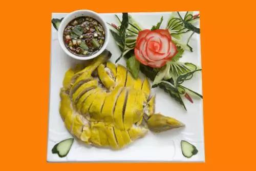 白河涼雞配上蘸料香辣可口、肉質滑嫩細膩,口感極佳,令人回味無窮。