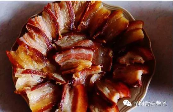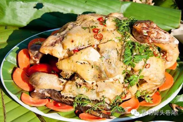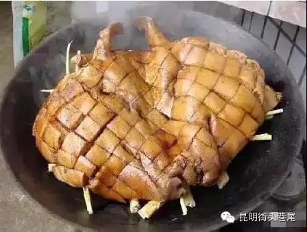 柳蒸豬頭是白族傳統名菜之一,把豬頭放在柳條架上入鍋蒸制而成。必須選用甜又鮮的柳條,不能選用苦柳,色澤金黃,肉質鮮香,味醇清爽,食而不膩,風味獨特。