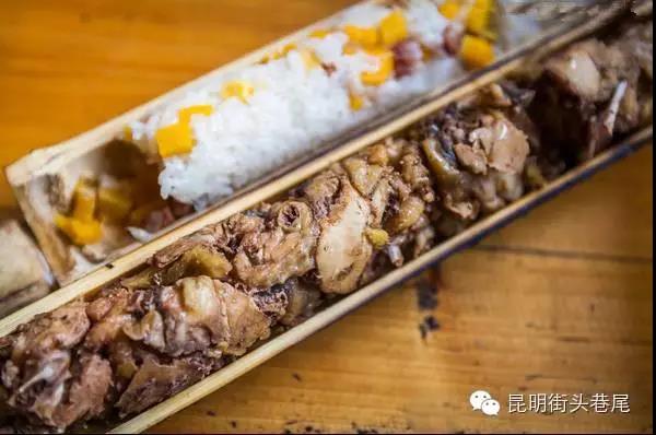 竹筒雞是云南哈尼族的傳統名吃,哈尼族人的居住環境滿山翠竹,他們就地取材,利用竹筒烹飪,歷史久遠。