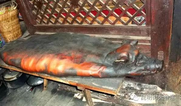 琵琶豬是納西摩梭人傳統風味食品,將宰好的豬去除內臟,抹上花椒、鹽等調料,用細繩縫嚴,用大木板石頭等壓制,成品的形狀好似琵琶,故稱“琵琶豬”。