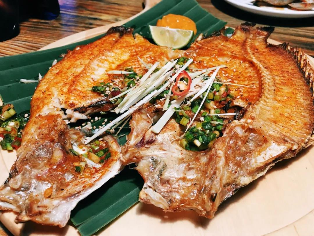 河口的燒烤攤一般就在魚塘不遠,魚是當天的新鮮魚,加上山上現摘的香茅草,野芫荽,蔥姜和醬油腌制30分鐘,上架用櫟碳火烘烤至焦黃上桌,然后沾著用干小米辣和酸醋做的作料吃。
